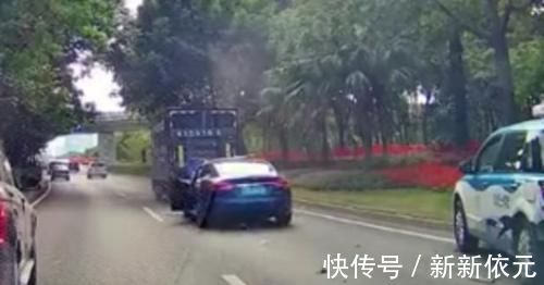 撞车后的特斯拉并未停止前进,随后再度加速再撞上一辆货车,疑似刹车失灵。