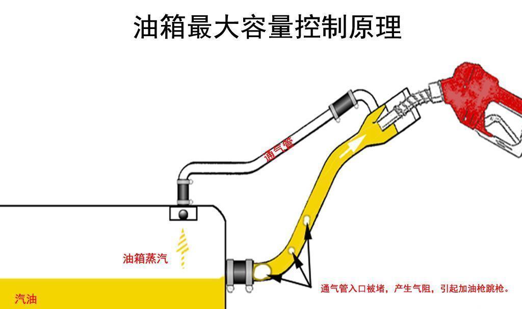 因为油箱里空气和燃油蒸汽,加油时它们会阻碍燃油流入油箱,所以油箱顶部都设置有通气管可以让空气和燃油蒸汽流出去以便于加油。而通气管的高度和油箱最大容量高度是一致的,当你加到最大容量位置时油面刚好堵住通气管入口,导致加油管那一侧产生气阻,引起加油枪跳枪,告诉你已经加满了。