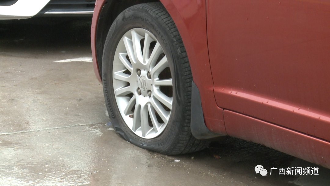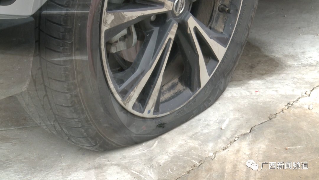 车主 曾先生:这辆车是昨天晚上12点多停的,我们平时也是停这里的,我们刚刚下来就发现这辆车被放气了。