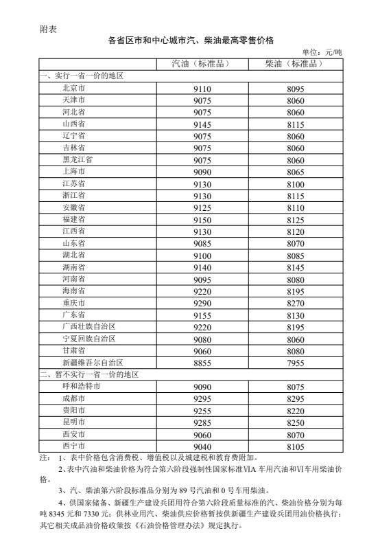 根据近期国际市场油价变化情况,按照现行成品油价格形成机制,自2021年10月9日24时起,国内汽、柴油价格(标准品,下同)每吨分别提高345元和330元。调整后,各省(区、市)和中心城市汽、柴油最高零售价格见附表。相关价格联动及补贴政策按现行规定执行。