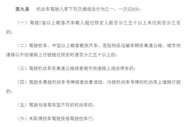 相比"2016版"交通违法与记分,2022版记分的交通违法共50项,其中7项记12分,7项记9分,11项记6分,15项记3分,10项记1分。记分类型增加了扣9分、删除了扣2分的违法行为。在这次调整中,有部分道路交通安全违法行为扣分减少,例如:驾驶与准驾车型不符的机动车12分降为9分、驾驶机动车违反禁令标志、禁止标线指示3分降为1分