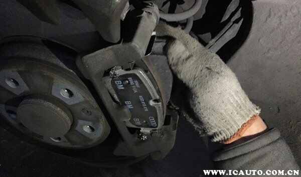 ③打开制动钳盖罩,将新的刹车片放置好。将有文字标识的一面朝向外头,无字的一侧朝里。
