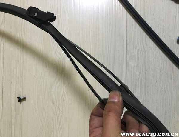 ①按照车头方向掰动雨刮器,到达特定位置时会固定住。按下雨刮器的固定按钮,用手捏住雨刮片,稍微使力往外抽动,即可将老胶条取出。