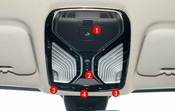 宝马X7的天窗开关位于主副驾驶遮阳板之间。同时还集成了紧急呼叫、照明灯、车内灯光等多个功能按键。