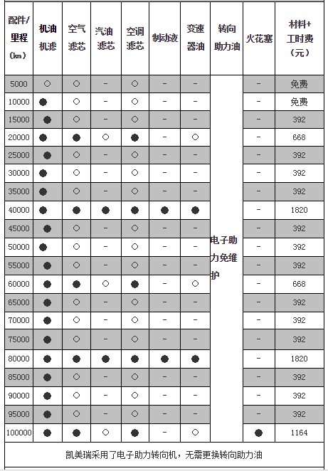 丰田凯美瑞每4万公里时做一次大保养费用大概为一千多,车辆行驶10万公里所需保养费用共为10147元。另外,混合动力的车型做一次小保养费用为537元,同样在4万公里时做一次大保养,车辆行驶10万公里所需保养费用共为14162元。大保养需要更换机油和机油滤芯,空调滤芯,空气滤清器,汽油滤清器这“四滤”,还有火花塞、冷却液。