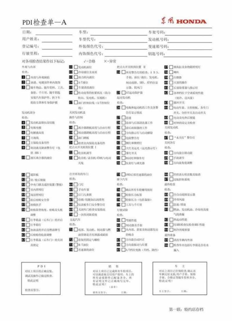 1、务必进行全面的PDI检查,在PDI检查单上,应该仔细核对车辆信息,包括车型、外观颜色、内饰颜色、车架号等。此外,外部检查也是至关重要的,需要检查灯光功能是否正常以及车漆上是否有刮痕或掉漆等问题。