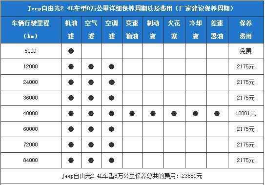 Jeep自由光保养手册:自由光保养一次是2175到10801元,按照官方的保养周期来计算,自由光2.4L车型和3.2L车型行驶6万公里的常规保养总成本分别为8697元和6852元,这个价格在同级别中相对较为便宜。