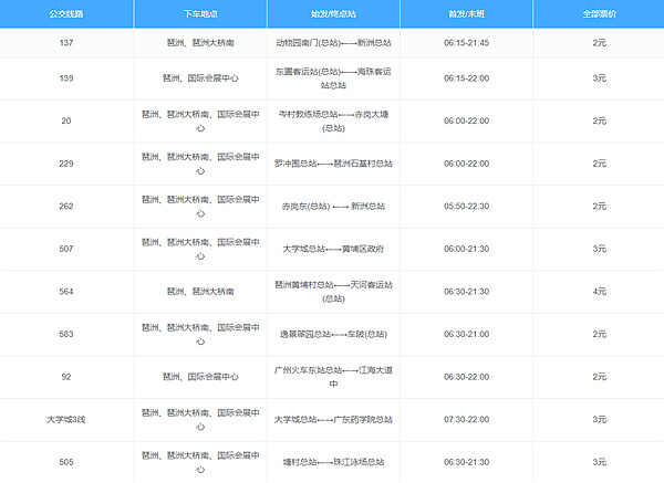 8号 | 新港东、琶洲 | 凤凰新村←→万胜围 | 06:15-22:40 | 6元 |