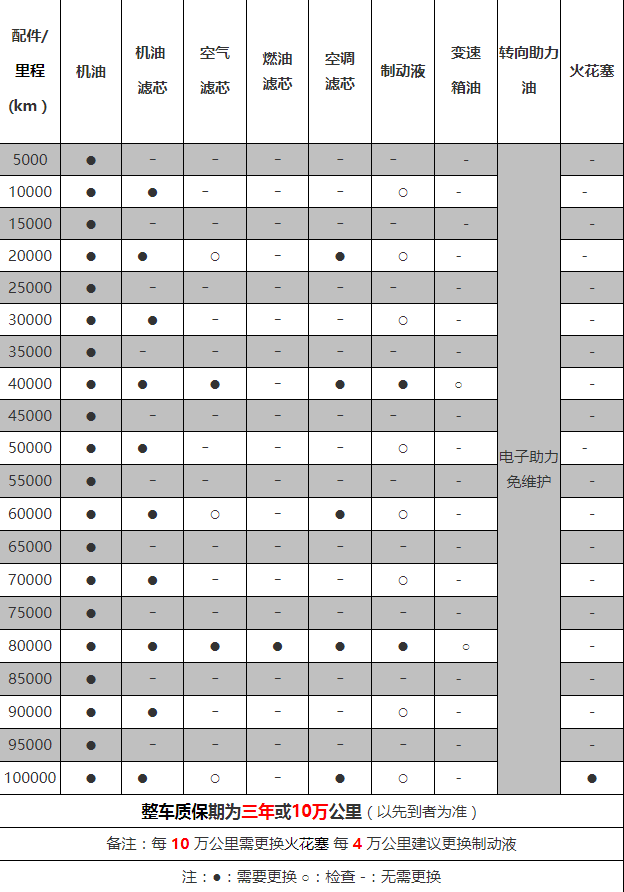 绅宝x35也成为了同级车型中的佼佼者。在维修保养方面,东风风光的提供的整车质保周期为36个月或10万公里,而在之后的保养周期方面,每5000公里进行保养属于一个相对标准的周期。下图是绅宝x35的保养手册: