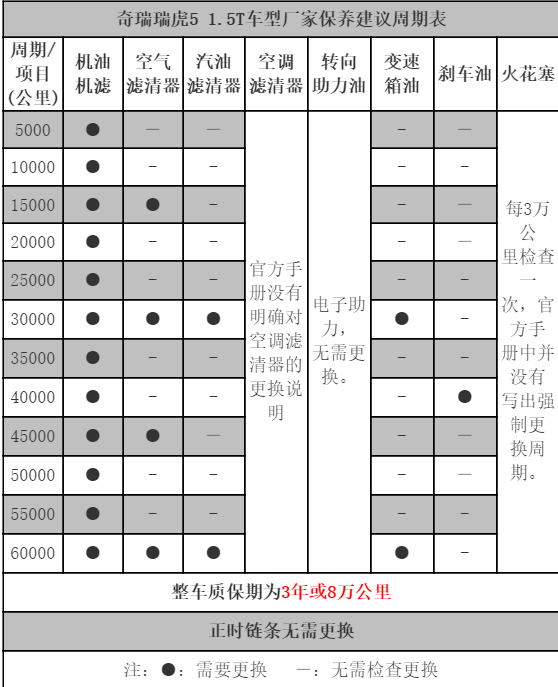 经销商方面给出的保养周期和官方的一样都是5000公里,每5000公里更换机油机滤,每1万公里更换机油和四滤(机滤、空滤、汽滤、空调滤)。另外,助力油在15000公里更换,以后为每4万更换一次。根据瑞虎5经销商经销商建议保养周期表和保养配件价格表,瑞虎5九万公里保养费用(材料及工时费合计)为MT:816元CVT:1416元。总保养费用为MT:11140元CVT:12711元。九万公里保养项目包括更换机油机滤,空气滤清器,汽油滤清器,空调滤清器,变速箱油和火花塞。
