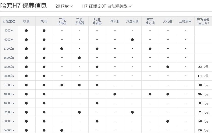 建议哈弗H7的车主每隔5000公里进行一次常规保养。在6万公里之前,主要是更换机油机滤和机油三滤两类保养相互交替进行,而全车油液的大保养集中在6万公里时进行。