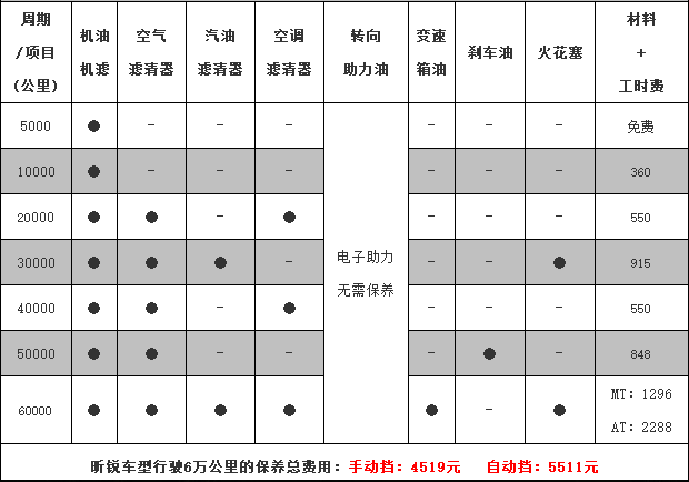 空调滤芯每隔2万公里更换一个,当然这个换的勤一点对车身乘员的身体有好处;汽油滤芯更换相对有些频繁,每隔3万公里一次;手动变速箱油和自动变速箱油均在6万公里时更换。