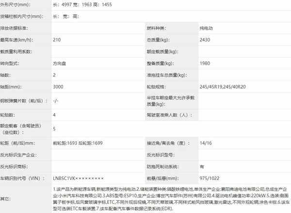 据工信部发布的信息显示,小米SU7的车身尺寸为4997x1963x1455(1440)mm,车身轴距为3000mm,使得该车达到了中大型轿车的标准。车辆将采用5座布局,预计会提供出色的后排和行李箱空间。