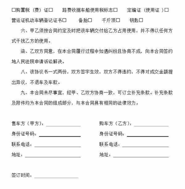 4、使用期限与方式:约定车辆的使用期限和方式,例如是否允许出租、转卖等行为,并明确禁止超出协议范围的使用;
