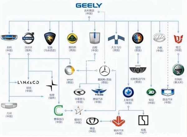 吉利集团旗下的自主品牌、合作品牌:
