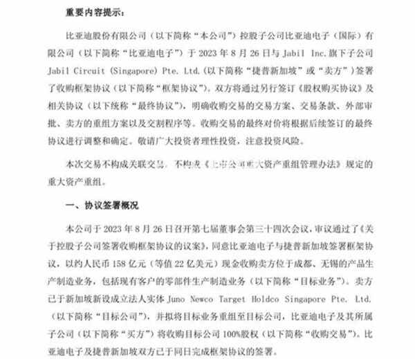根据最新消息,比亚迪电子(国际)有限公司于2023年9月26日,与捷普旗下子公司Jabil Circuit (Singapore) Pte. Ltd.(捷普新加坡)签署了收购框架协议,完成了对捷普新加坡在成都、无锡的产品生产制造业务的收购。此次收购,比亚迪花费了158亿元人民币,而且都是现金。