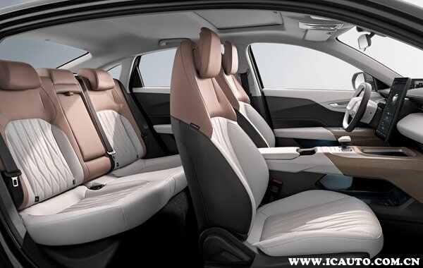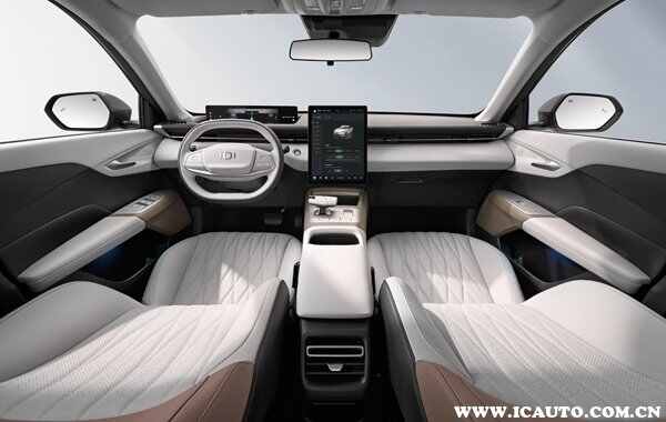 启源A05的内饰方面采用了环抱式座舱理念。它配备了悬浮式长方形液晶仪表和悬浮式纵置中控屏的双屏布局。空调出风口贯穿整个中控台,而双辐式方向盘的造型接近矩形。岛台区域装备了游艇式换挡杆,并只保留了少量物理按键。此外,中央档位下方进行了掏空,以增加前排储物空间。