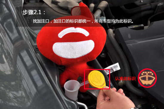 1、打开机盖后需要找到玻璃水所在的位置,绝大多数车的喷水壶都在发动机舱右边,喷水壶盖儿上边都有一个和指示灯一样的标志,这个标志全球生产的所有汽车都一样。