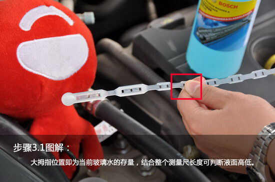 2、只要打开壶盖儿就可以给里边加玻璃水了,一般的车需要加2升左右。壶里有一个软尺,一边加一边看,到了刻度线就不要加了,加多了容易溢出来,造成不必要的浪费。