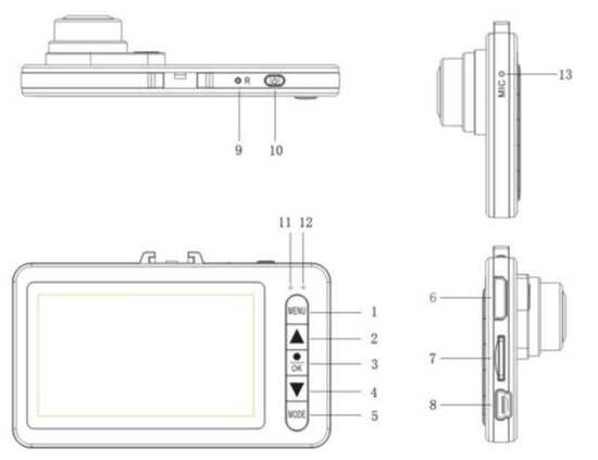 5)模式选择按钮:短按此键在摄像/拍照/回放之间相互切换;录像过程中短按此键会对当前视屏加锁;
