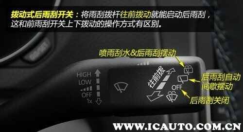汽车的后雨刮器开关和使用图解如下图所示,将雨刮拨杆往前后拨动就能启动后雨刮,这个操作和前雨刮开关上下拨动的操作方式有区别,将拨杆往前后拨动即可控制后雨刮器的开关还有雨刮器的间歇摆动,还可进行后雨刮的自动以及后雨刮器的喷水。后雨刷就是汽车后风挡的雨刷器,后雨刷多配备在SUV、MPV、两厢车及部分掀背车上。