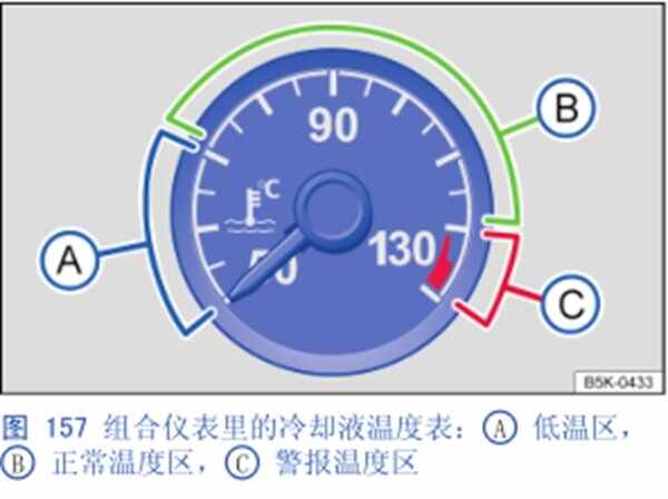 提示:正常行驶条件下,防冻液温度指针应处于表盘中央(正常温度90摄氏度左右),发动机大负荷运转冷却液温度升高时(尤其在环境温度较高时)指针可能向右偏转。打开点火开关时若干警报/指示灯将点亮,进行功能检测,数秒钟后熄灭。如果发现防冻液变质应该及时更换。