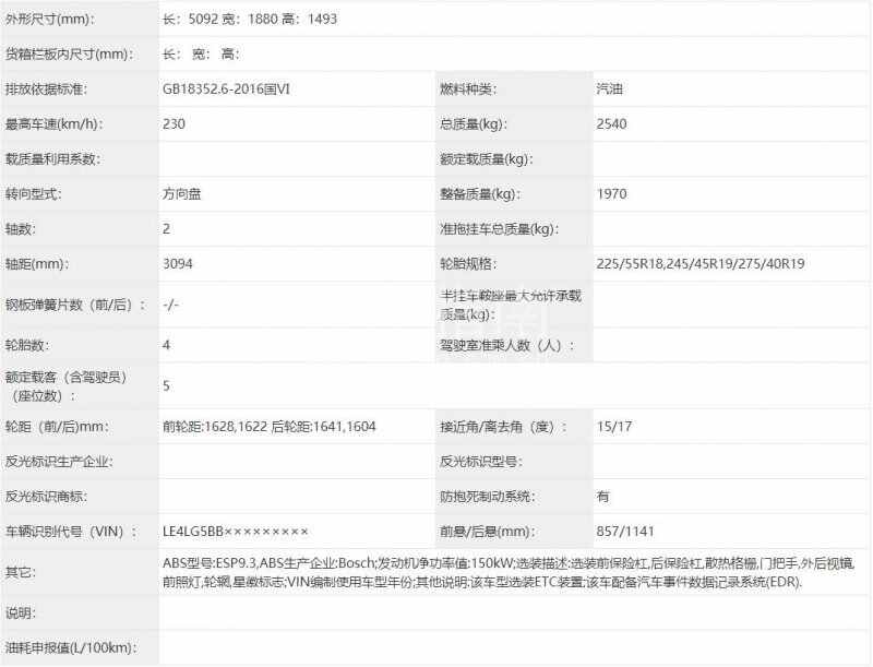 而在车后方,新车是采用了一个贯穿式灯组,两侧可以看到各两个三棱形的灯带,有着较好的视觉效果,下方则用银色镀铬进行了装饰。在尺寸方面,新车的长宽高为5092/1880/1493mm,轴距3094mm。