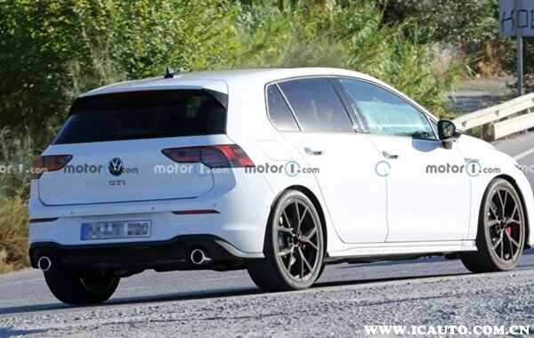 车身侧面基本保持不变,测试车辆采用了黑色双五辐轮毂及红色刹车卡钳,后挡风玻璃上方保留扰流板,车尾配备分体式尾灯,“GTI”身份标识位于大众后车标LOGO下方,底部排气口依旧是双边双出布局。