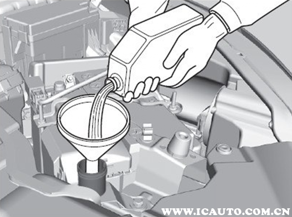 建议每次加注燃油时,检查发动机防冻液液位。先检查储液罐。如果储液罐已完全变空,同时检查散热器中的防冻液液位,并添加相应的发动机防冻液。如果没有东风本田防冻剂/ 防冻液,可暂时使用。其它知名品牌不含硅酸盐的防冻液代替。检查并确认是否为铝制发动机推荐使用的高品质防冻液。持续使用其它非东风本田防冻液会导致腐蚀,造成冷却系统故障或无法使用。尽快使用东风本田防冻剂/ 防冻液冲洗冷却系统,并重新加注。