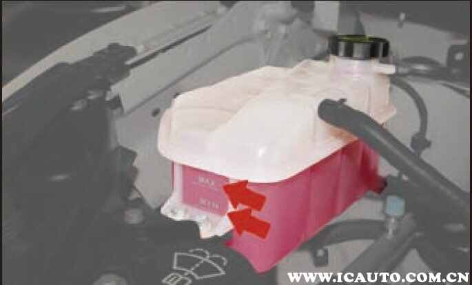 随着发动机温度的变化,副水箱中的冷却液液位也随之变化。但是,如果液位在“MIN”( 低液位) 线或以下,则须加注冷却液,使液位达到“MAX”( 高液位) 线。