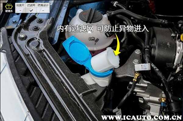 柯米克玻璃水加注口位于发动机舱左侧位置,加注玻璃水的时候需要准备一个漏斗,一瓶玻璃水。需要多久加一次玻璃水并没有说明,但一次加多少玻璃水可以参考刻度尺上的刻度来进行添加。现在为大家展示玻璃水的位置图: