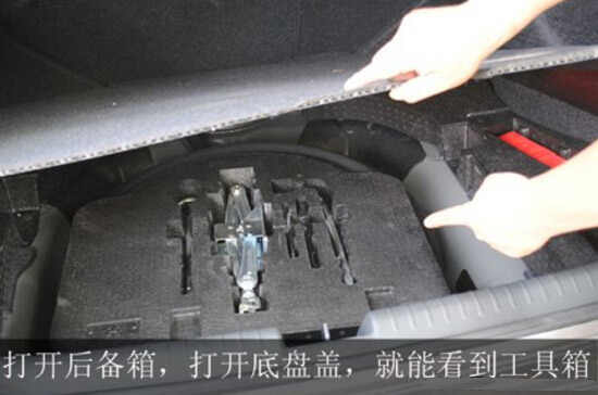 第二步、打开后备箱取出应急工具箱,并且将后备箱底部盖板掀开,可以看到你的爱车备胎。用工具箱内的扳手,按照正确的方式打开备胎固定夹,取出备胎。同时,在后背箱内会有一个简易式千斤顶,同样取出。