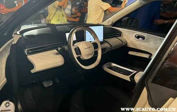 内饰方面,纳米01注重简约科技风格。车内配置了小尺寸的液晶仪表、大尺寸的中控屏、双辐式方向盘和电子怀挡机构。空调出风口贯穿整个仪表台,仪表台和中岛区域分离,并采用高档材料包裹,融入菱形元素。