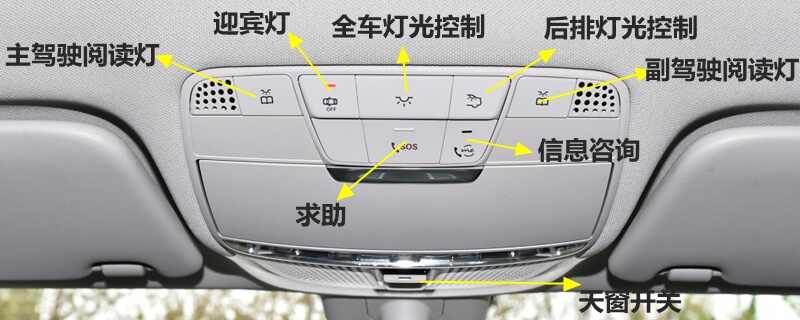 奔驰C300的天窗开关位于汽车前排车顶阅读灯位置处。前排车顶功能区还集成了主驾驶位阅读灯、副驾驶位阅读灯、后排灯光控制、迎宾灯、信息咨询、紧急求助等多个功能按键。