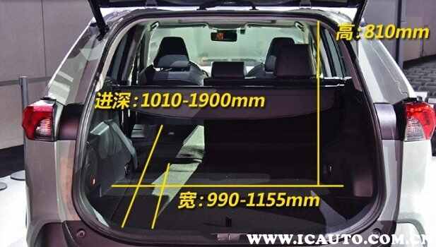 丰田rav4后备箱最小近深和最大近深为1010-1900mm,最小宽度和最大宽度为990-1155mm,高度为810mm。后排座椅可以4/6比例放倒,放倒后平整度比较好,空间也比较大。