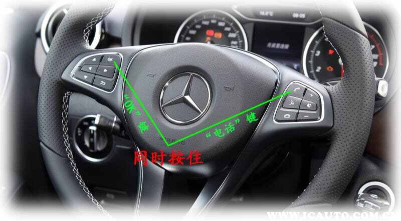 3. 同时按住方向盘左侧的“OK”按钮及方向盘右侧的“电话”按钮,直到出现菜单后松开。
