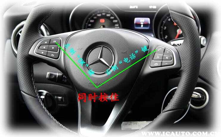 3. 同时按住方向盘左侧的“OK”按钮及方向盘右侧的“电话”按钮,直到出现菜单后松开。