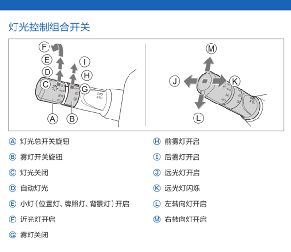 哈弗F5灯关组合开关被集中在了方向盘柱左侧,这也是目前绝大多数汽车的处理其的方法,灯关组合的使用参照下图。(注意:使用灯关时请勿将位置灯代替近光灯使用,否则极易发生事故风险。因位置灯的亮度不注意照亮车辆前方的道路,所以在天色昏暗时或能见度不佳时请开近光灯)。