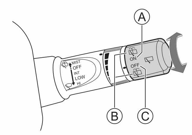Ⓐ 后雨刮开启;Ⓑ 后风窗玻璃洗涤将后雨刮旋钮向上或向下旋至后风窗玻璃洗涤位置并保持住,后雨刮将使用风窗洗涤液刮刷后风窗玻璃。松开后,后雨刮旋钮将自动回位;Ⓒ 后雨刮关闭。