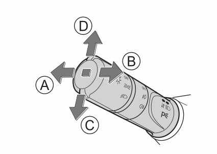 Ⓐ 灯光总开关旋钮;Ⓑ 雾灯开关旋钮;Ⓒ 灯光关闭;Ⓓ 自动灯光;Ⓔ 小灯(位置灯、牌照灯、背景灯)开启;Ⓕ 近光灯开启;Ⓖ 雾灯关闭;Ⓗ 前雾灯开启;Ⓘ 后雾灯开启。
