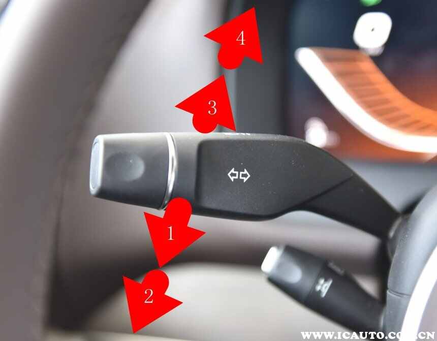 将灯光手柄重抬到第 2 / 4 挡位, 左/ 右转向灯以及仪表转向指示灯同时开始闪烁,方向盘回位后,灯光手柄恢复到原位。
