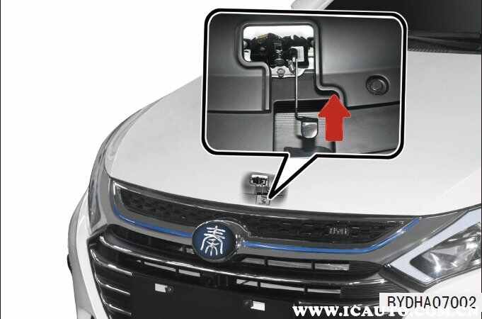 1. 换至驻车挡或空挡,拉起EPB 开关。然后拉起位于仪表板下本体左侧的前舱盖开启手柄,前舱盖将弹起稍许。