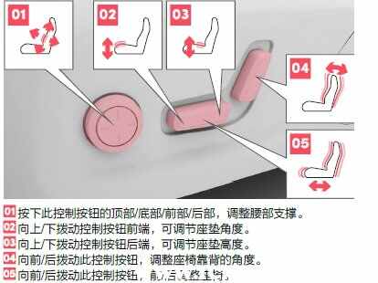 如果想将座椅位置储存在记忆按钮1中,需打开点火开关,并进行以下操作(使用按钮2来储存位置的方法相同):