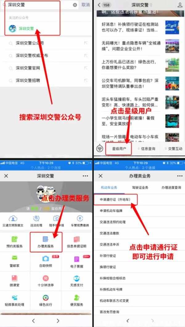 另一种方式是通过微信申请办法。首先,在微信中搜索并关注【深圳交警】微信公众号,然后进入公众号首页,并点击星级用户。在办理业务中找到申请通行证(外地车)选项,根据提示填写车主和车辆信息,并提交申请。经过审核通过后,你将会收到电子通行证或纸质通行证。
