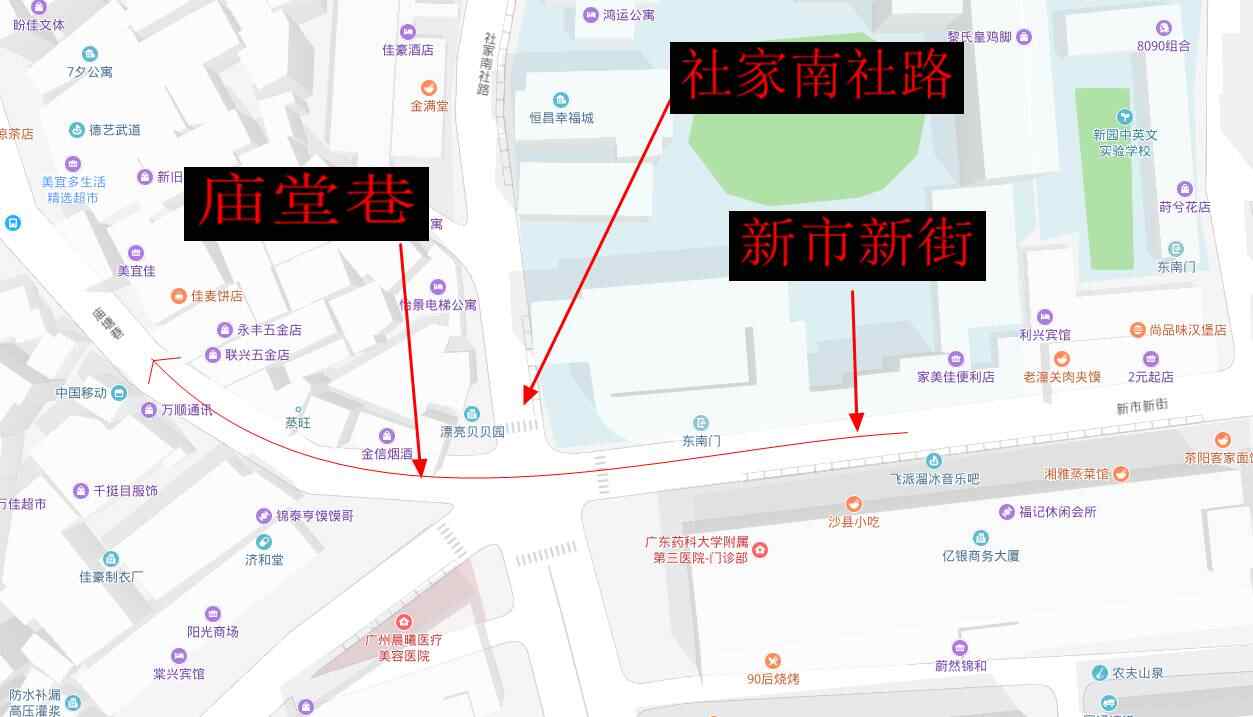 假设目前行驶在新市新街,打算要进入庙堂巷。而在米字路口处沿右前方行驶就是驶向庙堂巷,在米字路口右拐则是驶向社家南社路。此时导航就会提示沿着右前方道路行驶。