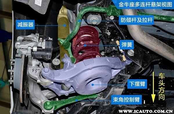后悬挂采用多连杆结构,金牛座的后悬挂下摆臂采用了结构较为复杂的H型控制臂,全铝制的下控制臂表现优秀。约束控制臂采用了钢材,由钢板冲压而成,之所以采用钢材是因为考虑到悬架运动时产生的干涉问题,铝合金体积较大,容易和摆臂产生运动干涉。